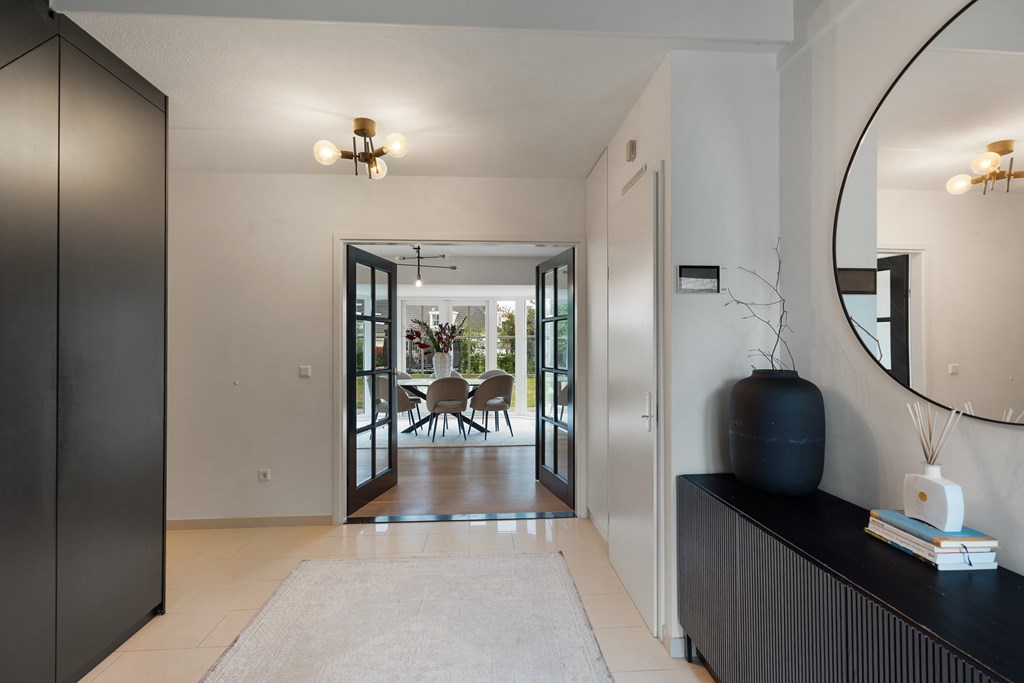 The entrance opens into a spacious foyer with a cloakroom and a staircase to the first floor. From here, there is access to the living room, the kitchen, and the master bedroom. The living room is bright and spacious, featuring large windows all around and direct access to the garden. The modern kitchen adjoins and is equipped with various built-in appliances, including a Siemens oven and microwave, a five-burner electric stove, and an extractor hood. On the ground floor is the master bedroom with an ensuite bathroom. The bathroom is neatly finished and includes a bathtub, walk-in shower, double washbasin and toilet.