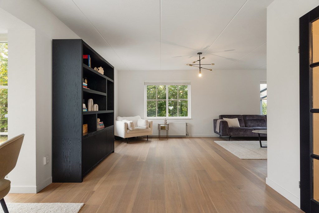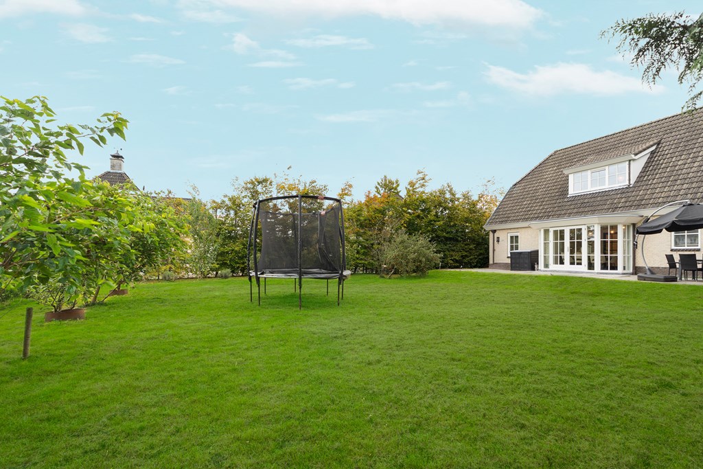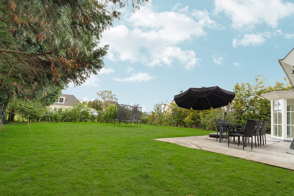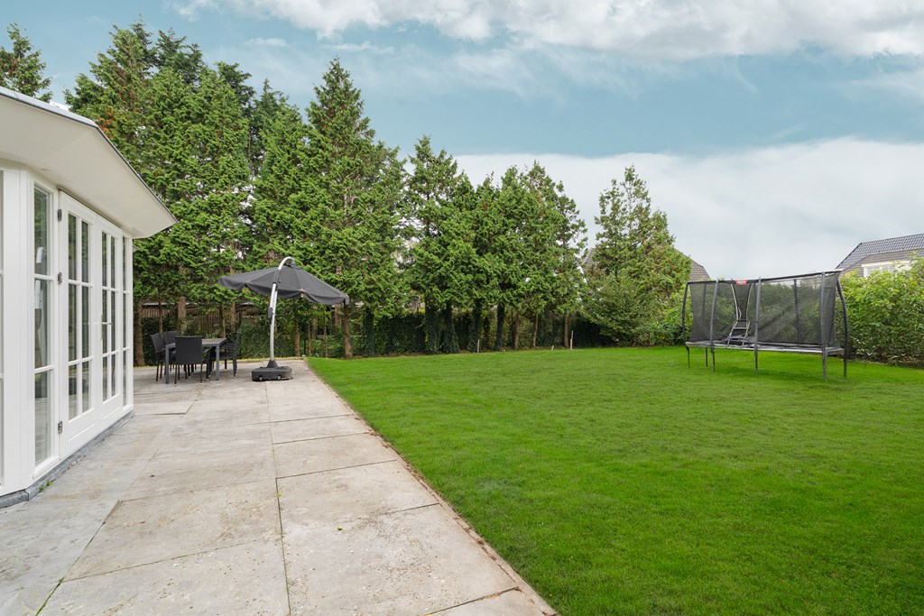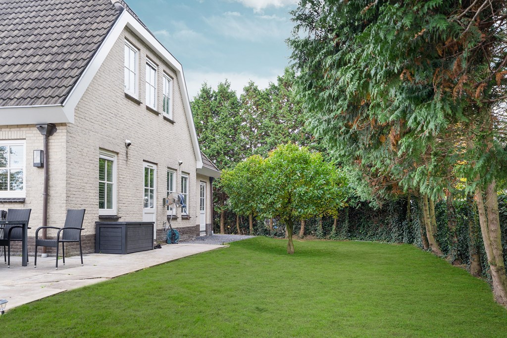 Surrounding the house is a large, beautifully landscaped garden that offers a lot of privacy. There are several terraces and seating areas, ensuring a sunny or shaded spot at any time of day. The garden is richly planted and features a variety of fruit trees, giving it a unique and charming character. The private driveway provides parking space for at least three cars, and there is a secure, covered bicycle shed with an electrical outlet.
