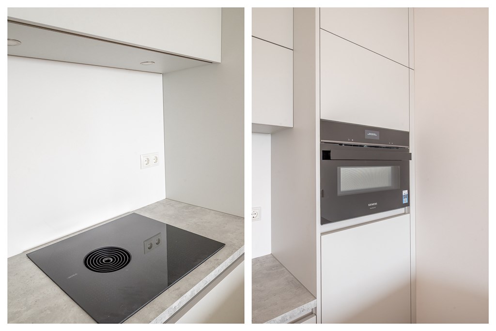 On the seventeenth floor, there are 8 apartments, including Meerluchtlaan 268. Upon entering, you will find a fully equipped open kitchen on the left side, fitted with a dishwasher, combi-microwave, fridge-freezer combination, and an induction hob with an integrated Bora extraction system.